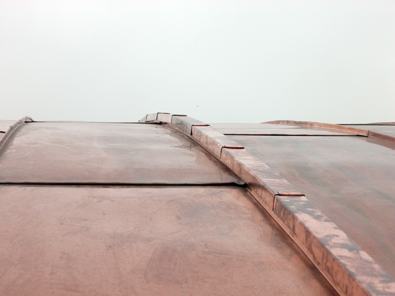 Colocación de chapas de cobre natural por el método de junta alzada. Fieltro monarpem colocada debajo de la chapa.