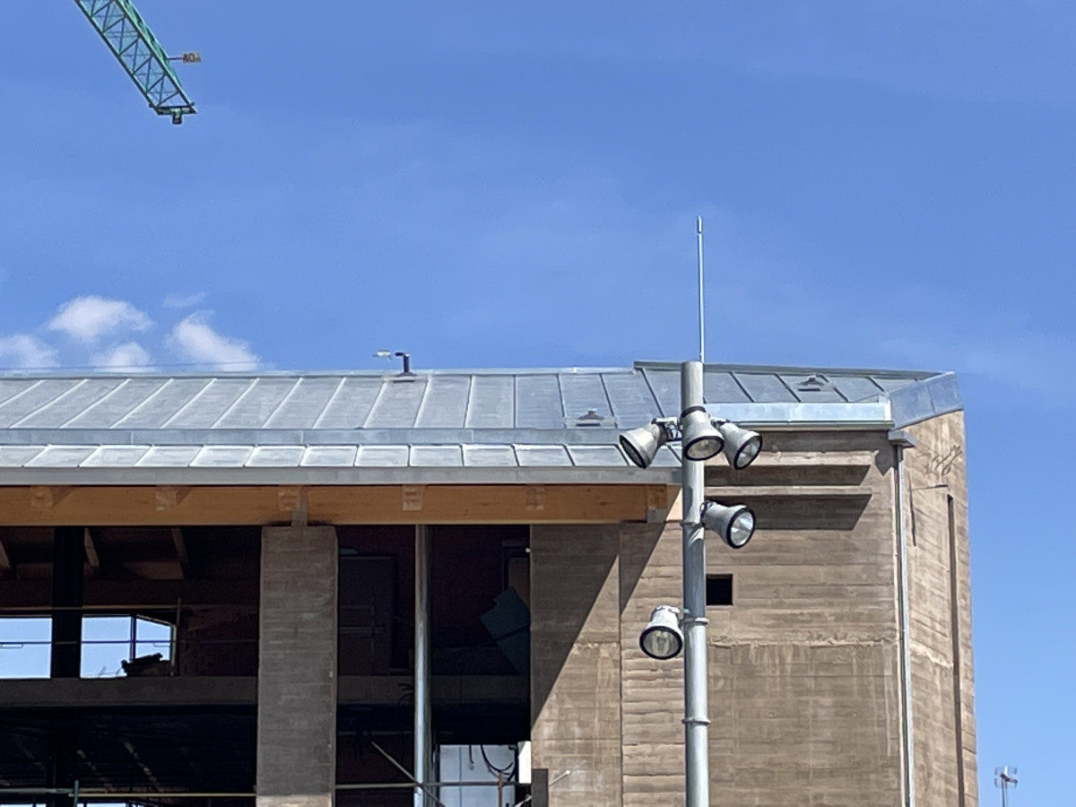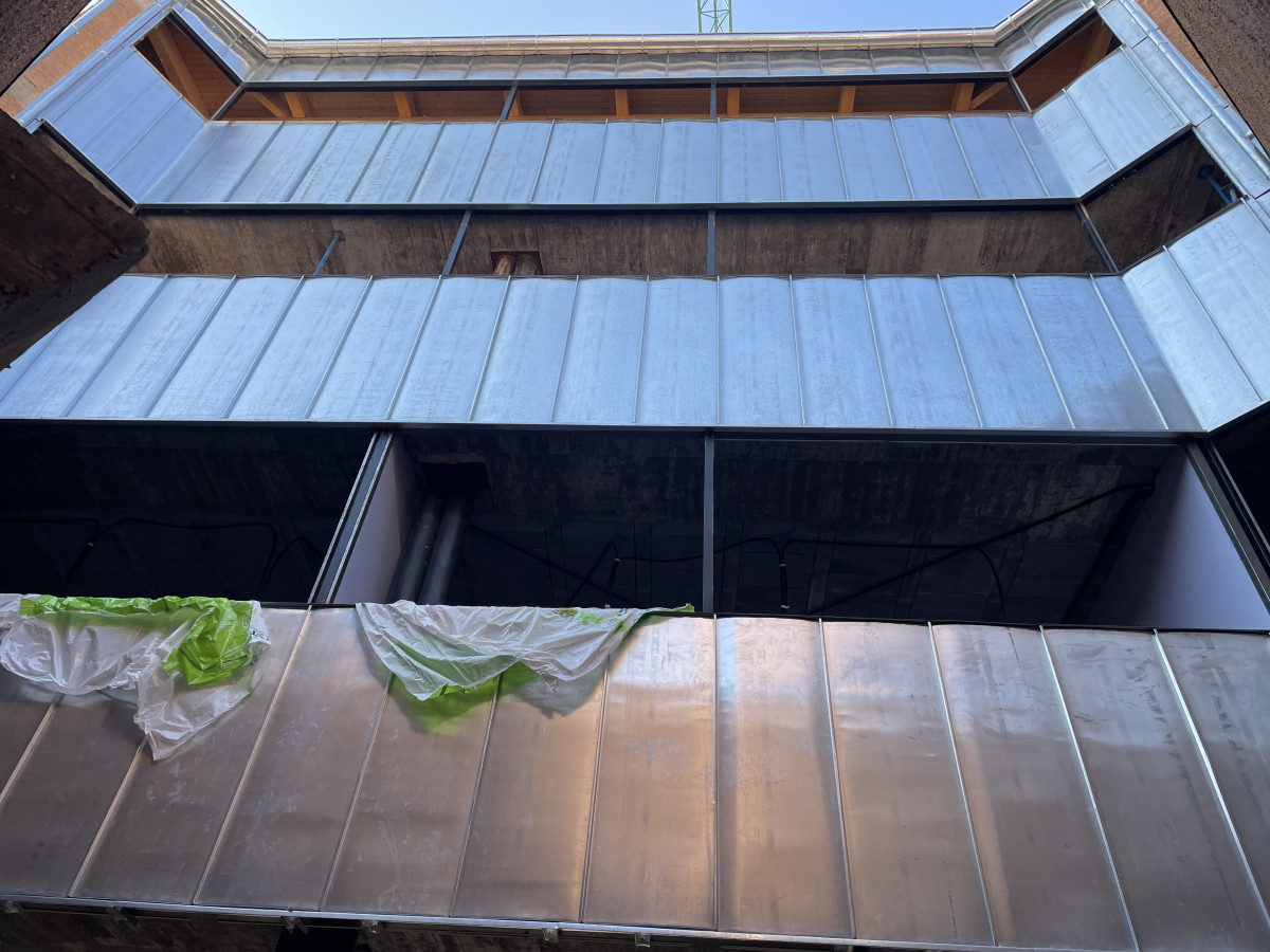Faldones y mansardas de cubierta, sistema de pluviales y solución anticaídas en el Centro Cultural de Carbajosa de la Sagrada (Salamanca), realizado con cobertura de Cinc Natural colocado con sistema de junta alzada; sistema de pluviales con canalones colgados y de pesebre en Cinc Natural de diferentes desarrollos y bajantes de Cinc Natural de 100 mm de diámetro.